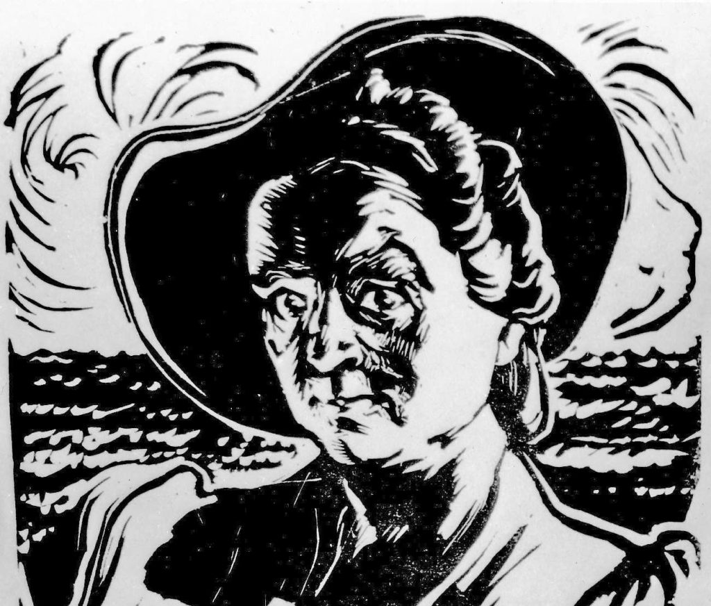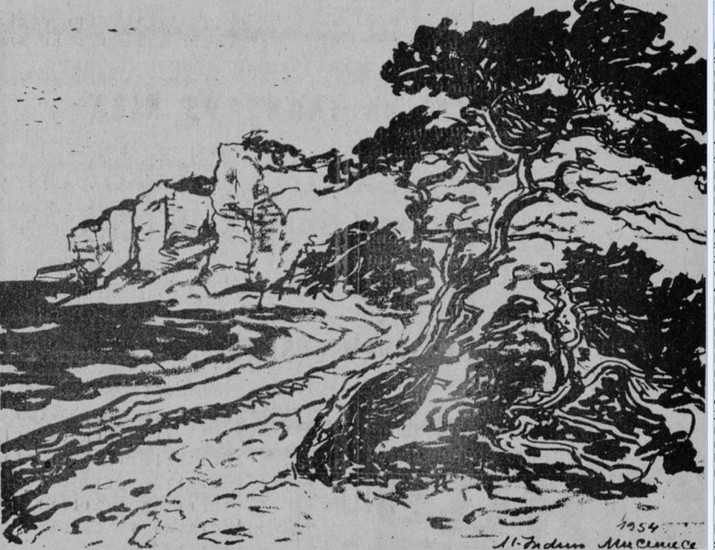 Marijas Induss-Mucenieces ogles zīmējums “Vējš no jūras”, ko no 1954. g. izstādes ieguva Parīzes pilsēta saviem mākslas krājumiem. (Sk. Roberts Legzdiņš “Latviešu māksla Eiropā”, Laiks, Nr.84 / 19.10.1974)